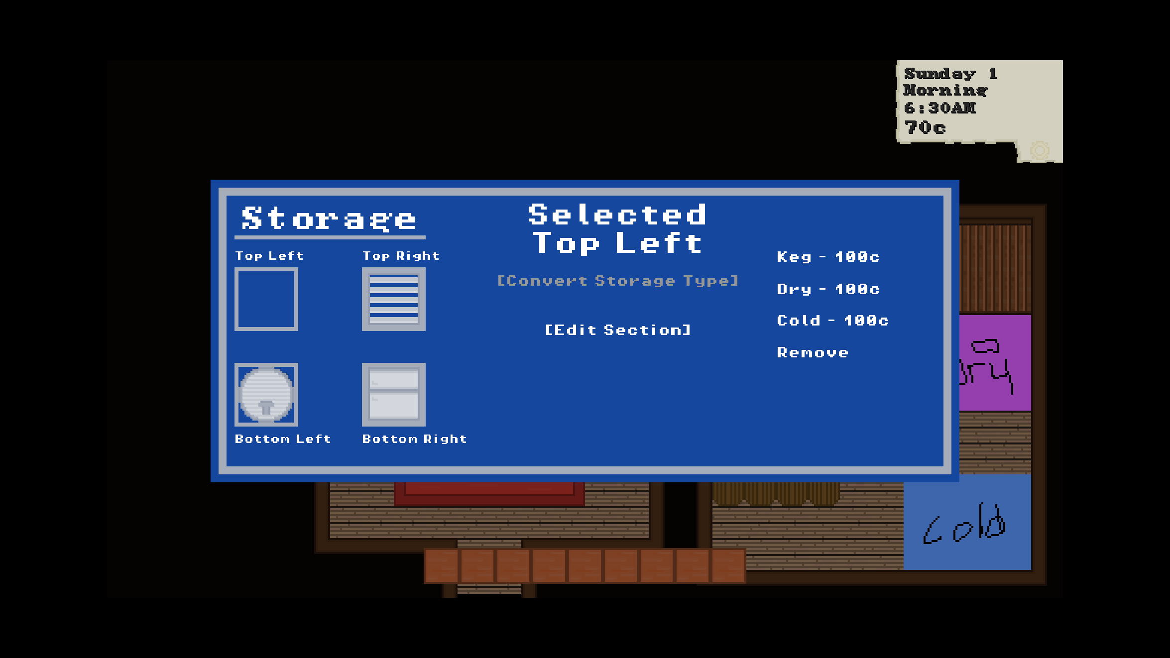Storage is the next big focus, as the player will need to store more items. I added a storage room next to the bedroom, with 4 sections. Each section can select a type of storage they want: Dry, Cold, or Keg. Keg is the only one done as of now, and is used for storing alcohol. To edit sections there is a blueprint in the bedroom. Along with storage types there are also variants within each type. These are good if you want to upgrade your storage or have better conditions.